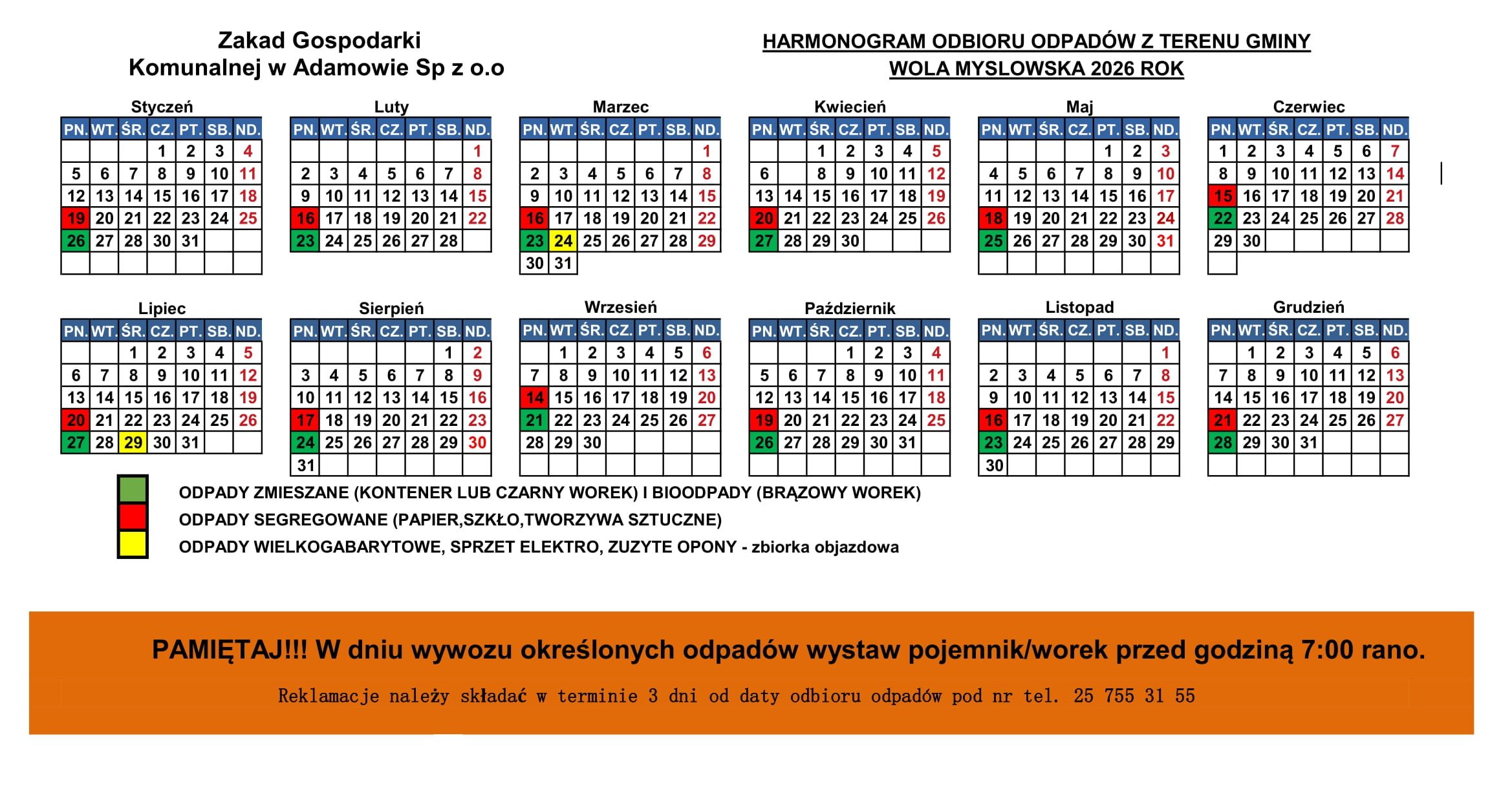 Pobierz do druku: Harmonogram odbioru odpadów na rok 2026