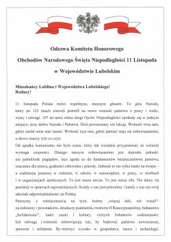 Odezwa Komitetu Honorowego Obchodów Narodowego Święta Niepodległości 11 Listopada w Województwie Lubelskim