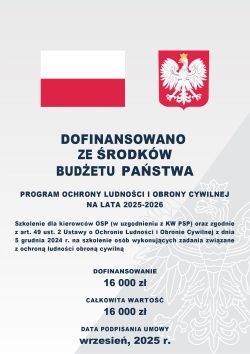 Łączna wartość ww. zadań wyniosła 278 560,07 zł przy czym z budżetu państwa otrzymano dofinansowanie w łącznej kwocie 251 813,58 zł. Ponadto na zadanie Szkolenie dla kierowców OSP (w uzgodnieniu z KW PSP) oraz zgodnie z art. 49 ust. 2 Ustawy o Ochronie Ludności i Obronie Cywilnej z dnia 5 grudnia 2024 r. na szkolenie osób wykonujących zadania związane z ochroną ludności obroną cywilną otrzymano dodatkowo dofinansowanie z budżetu państwa w kwocie 16 000 zł.