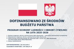 Gmina Wola Mysłowska otrzymała dotację celową z budżetu państwa na dofinansowanie zadań własnych w ramach Programu Ochrony Ludności i Obrony Cywilnej na lata 2025-2026. W 2025 r. w ramach programu zrealizowano następujące zadania:
