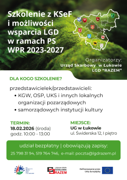 Urząd Skarbowy w Łukowie oraz Lokalna Grupa Działania ,,Razem” serdecznie zaprasza do udziału w bezpłatnym szkoleniu dotyczącym Krajowego Systemu e-Faktur (KSeF), które poprowadzi przedstawiciel Urzędu Skarbowego