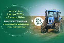 - od 3 sierpnia 2026r., do 31 września 2026r., producent rolny składa odpowiedni wniosek o zwrot podatku akcyzowego do wójta, burmistrza lub prezydenta miasta wraz z fakturami VAT stanowiącymi dowód zakupu oleju napędowego w okresie od 1 lutego 2026r., do 31 lipca 2026r.
